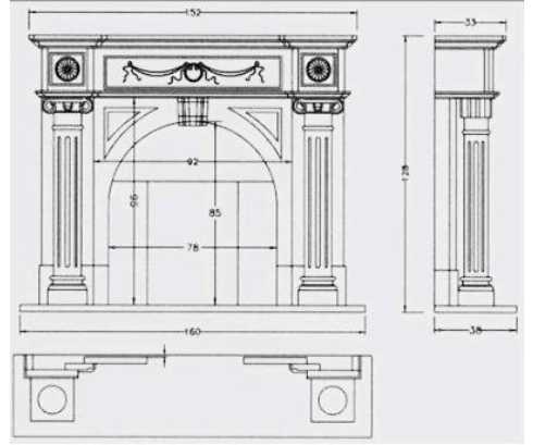 Этот поистине королевский портал выполнен из мрамора кремового цвета. Изысканные барельефы, арочное обрамление очага и строгие античные колонны превращают этот камин в настоящее произведение искусства.